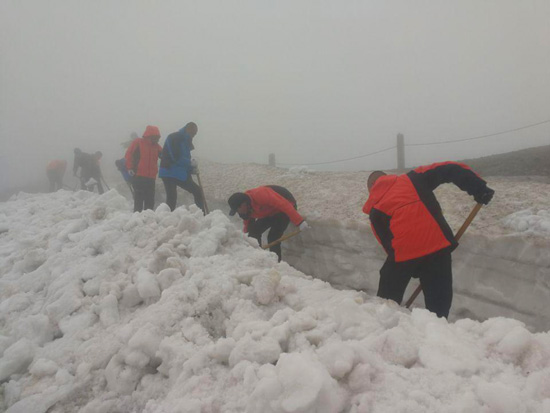 通往主峰的道路蜿蜒崎嶇,路邊的山體嶙峋陡峭,厚達4—5米的積雪綿延10多公里,陡峭的山體不時有碎石滾落,面對如此艱巨的工程,南景區(qū)員工迎難而上,勇往直前,再一次發(fā)揚了能吃苦、不怕累、打勝仗的決心和意志。員工們起早貪黑、櫛風(fēng)沐雨,短短一周的時間里,10多公里的積雪在清雪車的轟鳴中被一層層的剝離清理。5月11日,通往主峰天池停車場的道路全線貫通。
