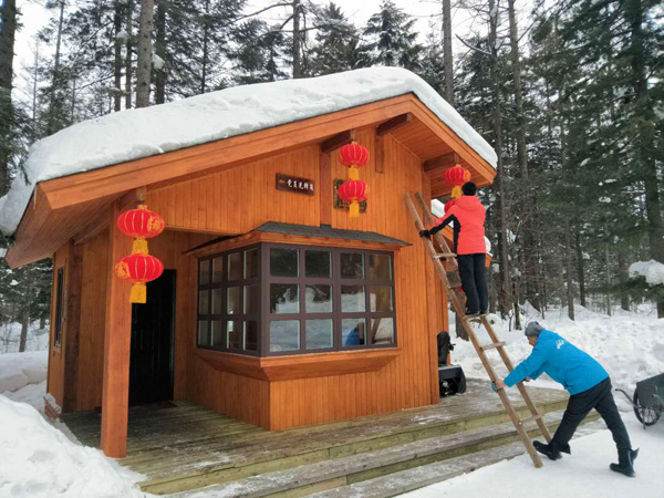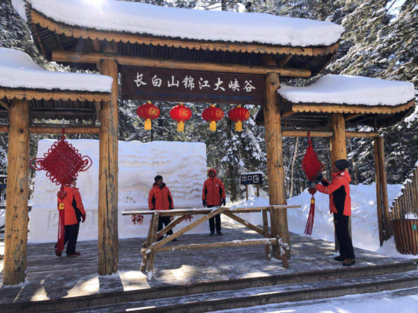 景區(qū)管理部經(jīng)理任昌龍按照要求,立即組織員工著手做準備工作,于2018年2月9日備齊所需物品,在峽谷景點出入口和員工執(zhí)勤亭兩處,高高掛起了紅燈籠和和中國結(jié)。在白雪的映襯下,入目的紅色更加艷麗,節(jié)日氣氛更顯濃郁,使來往游客及員工心情大好,無不駐足拍照留念,臉上洋溢著歡喜的笑容。