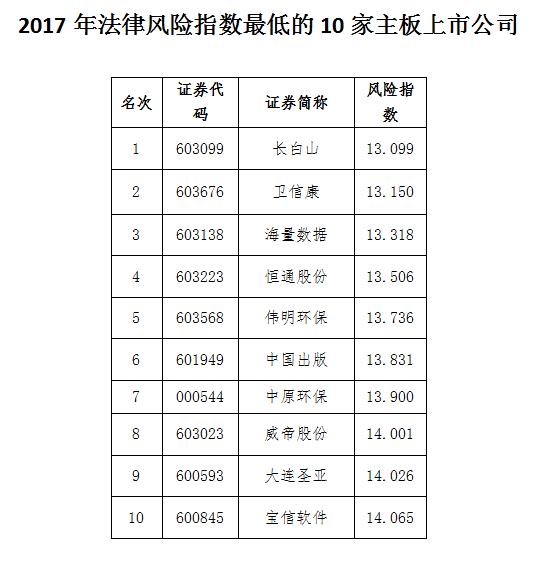 會上發(fā)布了《2017中國上市公司法律風(fēng)險指數(shù)報告》,對國內(nèi)3000多家上市公司法律風(fēng)險進(jìn)行了測評,涵蓋了A股99%的上市公司,主要指標(biāo)包括:違規(guī)事件、高管被追究責(zé)任人次、訴訟次數(shù)、涉案資產(chǎn)、員工素質(zhì)、重大擔(dān)保等。